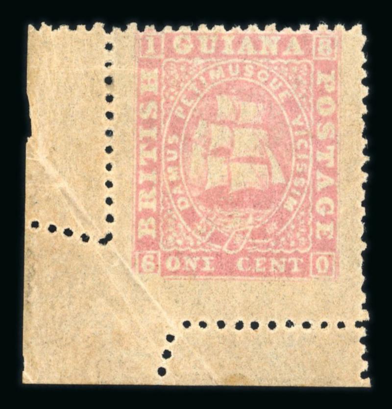 1860-63 1c pale rose mint lower left corner marginal showing perforation variety due to the corner folding over before perforation leaving the lower left corner imperf., very fine and rare stamp especially with this variety (S.G. £3'500+).