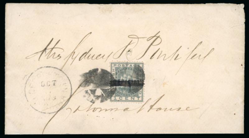 1878 (Oct) envelope sent locally with 1878 provisional "OFFICIAL" with horizontal bar tied by segmented "cork" cancels with Georgetown cds adjacent, spike hole clear of stamp, a very rare usage, plus 1c black unused and 2c orange used and 8c with horiz. and vert. bars used (stamps mixed condition).