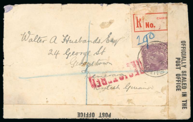 1926 (May 11) Incoming envelope from Australia with KGV 4 1/2d tied by Cairns cds with registered label above, with Brisbane, San Francisco, New York and G.P.O. B.G. arrival ds on reverse, with "BRITISH GUIANA/ OFFICIALLY SEALED IN THE POST OFFICE" tape along two edges, unusual.