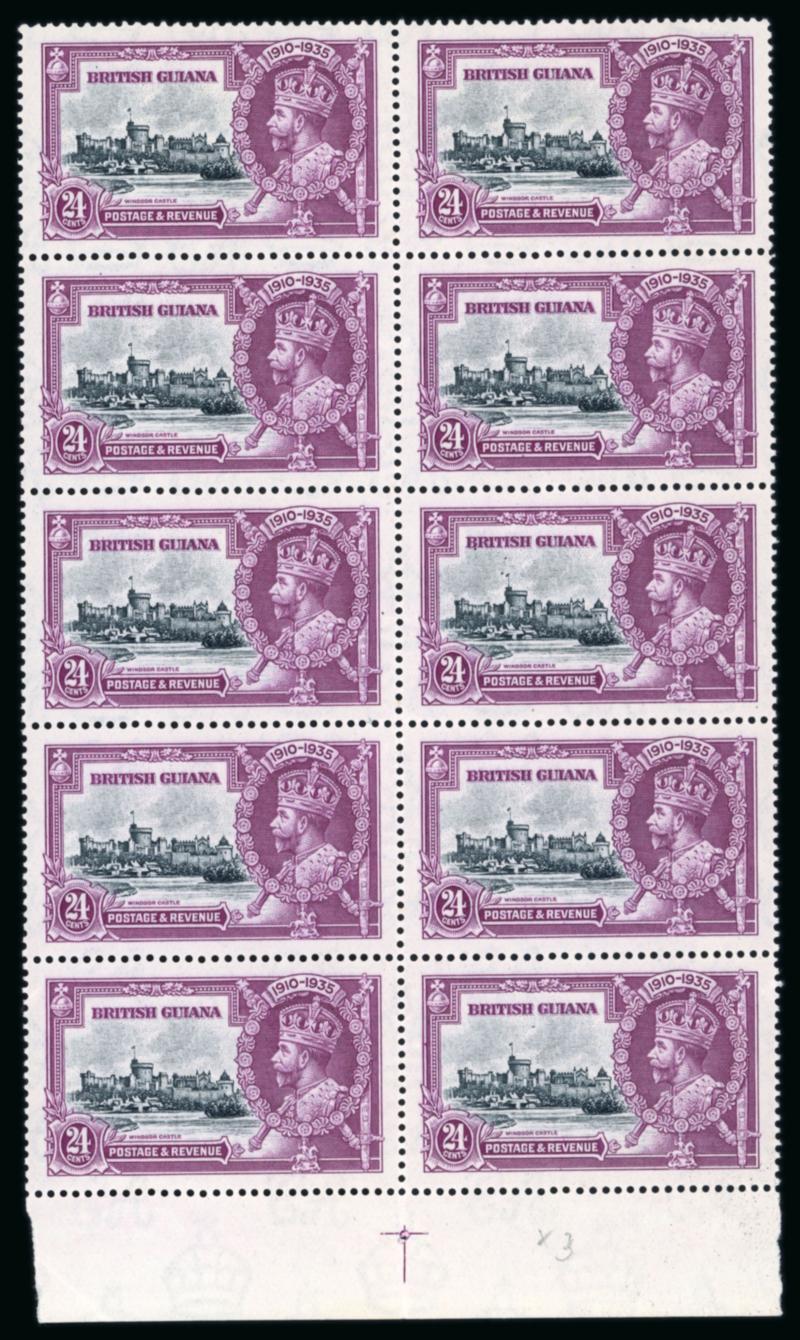 1935 Silver Jubilee 24c mint n.h. lower marginal block of 10 with lower right stamp showing "dot by flagstaff" variety, very fine (S.G. £375 for single example).
