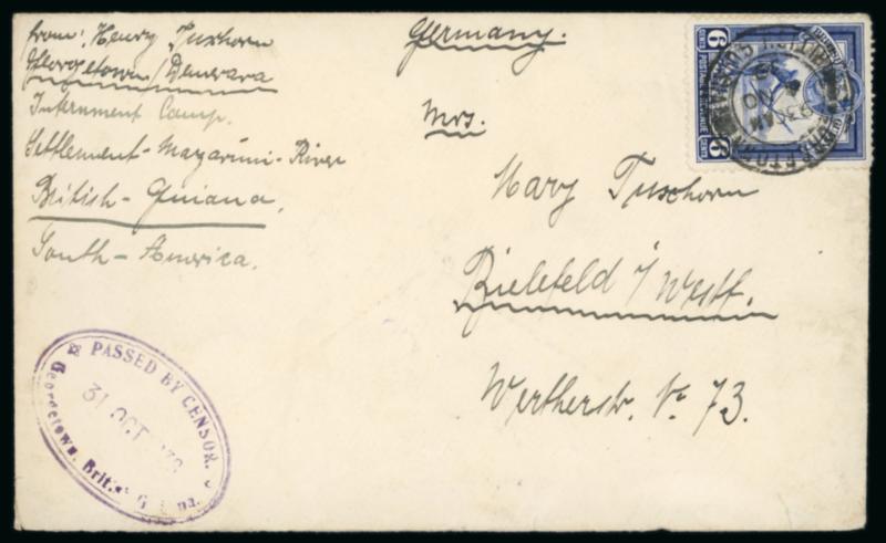 1939 (Oct 31) envelope from the Internment Camp in Demerara to Germany, endorsed at top left by the sender with "Internment Camp / Settlement Mazaruni-River", with "PASSED BY CENSOR / George town, British Guiana" cachet at lower left, franked with 1938-52 KGVI 6c tied by George Town cds, reverse wit