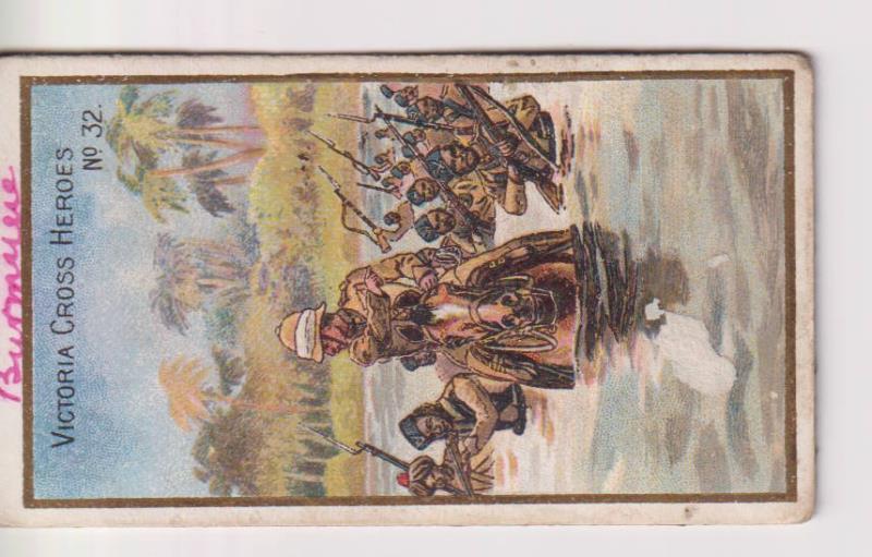 Cigarette card: 1901 "Victoria Cross Heroes", publ Taddy (set of 40): No 32 Lieut Grant ("Burmese War, 189?"). Multicoloured. Good average cond (minor faults). Rare. Murray cat £75.