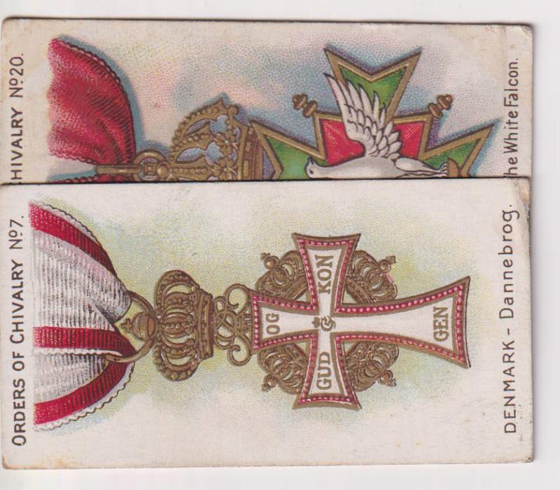 Cigarette cards: 1911 "Orders of Chivalry", publ Taddy (set of 50): No's 7 Denmark & 20 Saxe-Weimar. Multicoloured. Good cond. Rare. Murray cat £24 each.