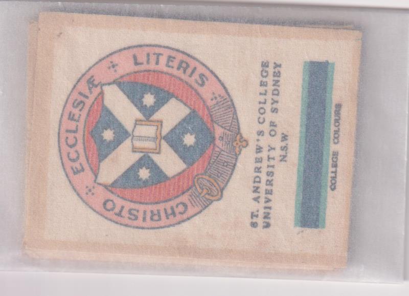 Cigarette cards: British American Tobacco Co. Ltd multicoloured printed silks: 1916 Crests & Colours of Australian Universities, Colleges & School, x 8 diff (all but one still with lightly adhered printed card back, showing individual number in set). Not