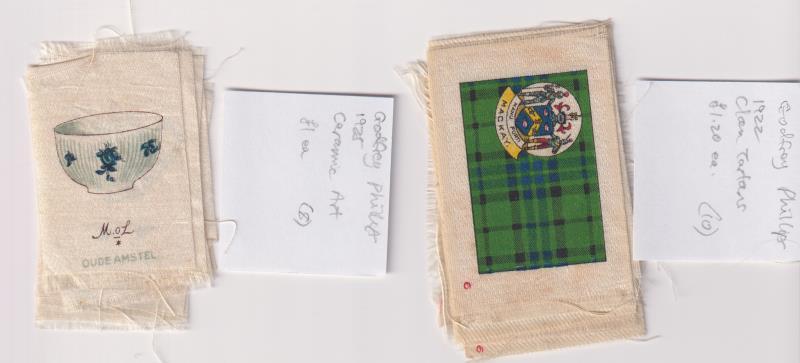 Cigarette cards: Godfrey Phillips Ltd multicoloured printed silks: 1922 Clan Tartans x 10 & 1925 Ceramic Art x 8. Murray cat £20.