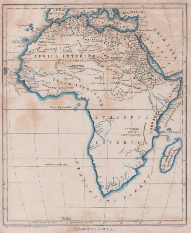 Map: Africa 1798. Ancient Africa map printed from J Withes copper engraving of 1798. Names in Latin. Map measures 22.5cm x 18.5c, foxing.