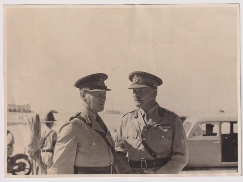 Military WWII real photo (18 x 13cm), close-up portrait of Generals Freyberg (of NZ) & Auchinleck in uniform, with staff car in background. Appears taken in North African desert. Some light creasing.