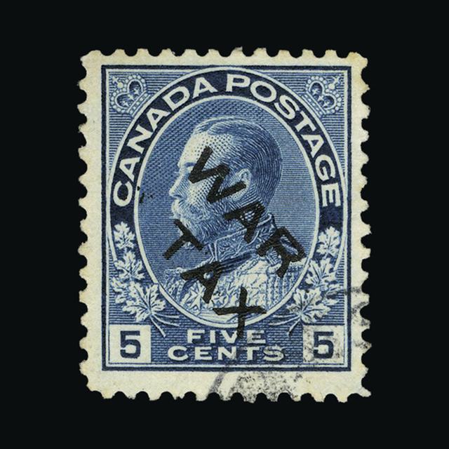 1915 KGV - WAR TAX - 5c blue, very fine used, hinge trace. Slight discolouration along part of top perfs. {U} (Start Price / Minimum Bid) = £68.00)