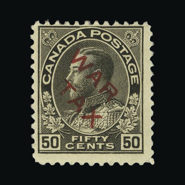 1915 GV War Tax ovpt on 50c spia unused no gum, centred E with small tone spot on Back. {MH} [US1] (Start Price / Minimum Bid) = £28.80)