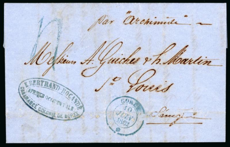 1862: Lettre de Casablanca pour Saint Louis, Sénegal, "par Archimède", oblitération cachet bleu du 10.06.1862 de Gorée, très belle frappe, peu courant. Taxe au crayon.