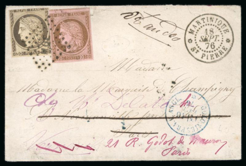 1876, lettre Colonies générales affranchie des n°18 10c brun s. rose et n°20 30c. brun de St Pierre (Martinique) le 18/10/1876 pour Paris, oblitération MQE . Cachets d'arrivée et de transit au dos.