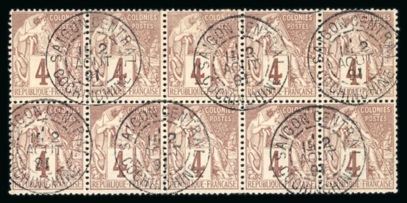1881, type Alphée Dubois 4cts lilas-brun Y&T n° 48 superbe bloc de dix timbres oblitérations cachet à date Saïgon/Cochinchine, superbes frappes, TB.