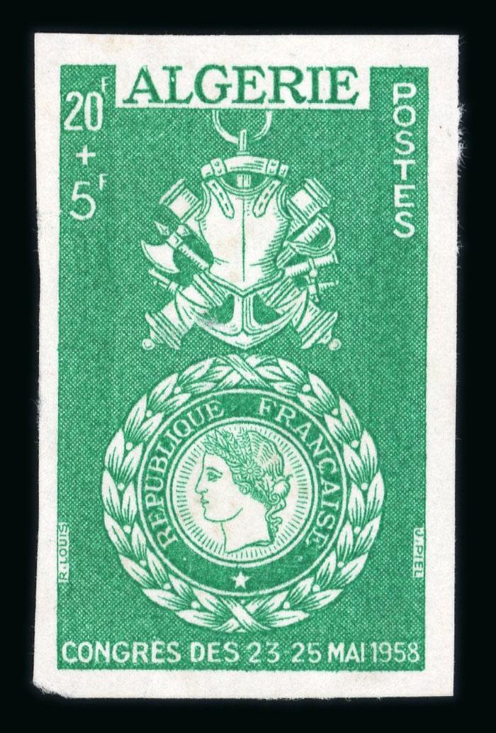 1958, Algérie essai non dentelé sans gomme du n°363Aa, quelques dizaines d'ex connus, petits défauts comme souvent sur ces timbres. Certificat Calves (2025). Cote 3'000€. Rare.