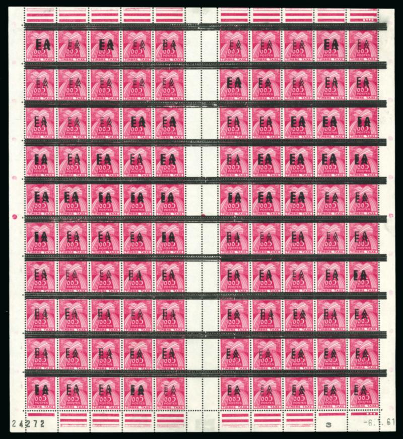 1961, timbre-taxe type Gerbes 5cts surchargé EA Y&T n° 54, feuille entière de 100 timbres neufs ** MNH datée du 06/01/1961 tous avec double surcharge typo de Tizi Ouzou, six des sept types de surcharges connus sont présentes dans la feuille qui est sans doute une feuille d'essai pour la mise en rou