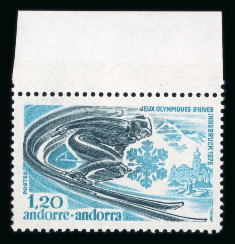 1976, JO d'Innsbruck Y&T n° 251 superbe variété sans la couleur olive neuf ** MNH, joli bord de feuille, timbre rare, signature et certificat Calves.