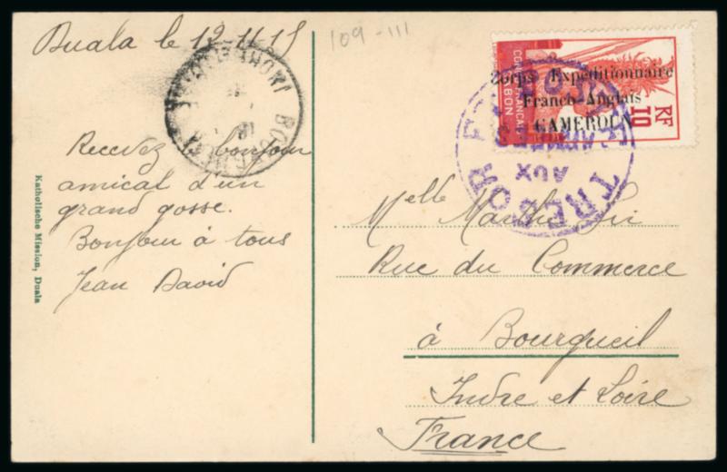 1918, très belle lettre recommandée pour Lomé au Togo affranchie avec Y&T n° 38 en bande de cinq, n° 41, n° 42, n° 44 et n° 46 (3), spectaculaire et TB.