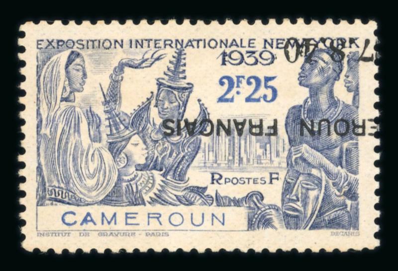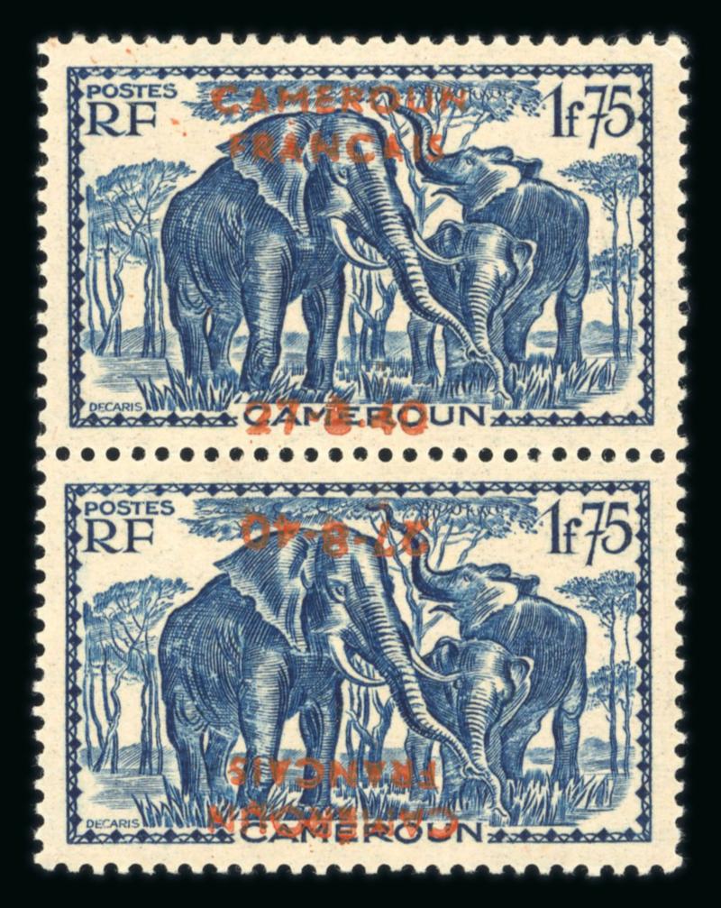 1940, 1f75 bleu surchargé Cameroun Français 27/8/40 Y&T n° 227b superbe paire avec surcharge tête-bêche neuf ** MNH, gomme coloniale, TB et signé Scheller, grande rareté, cote €2500.