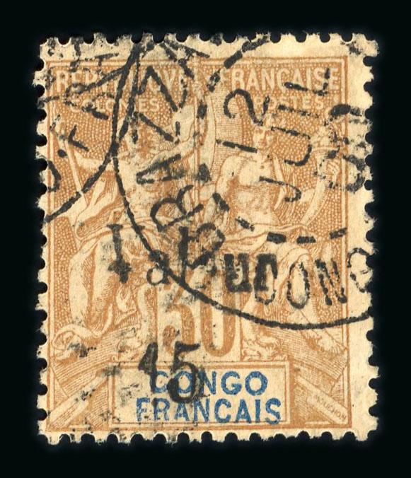1900, Congo Y&T n°26 timbre de 1892 surchargé 15c sur 30c brun oblitéré BRAZZAVILLE du 12 juillet 1900. Belle frappe, surcharge bien visible. TB. Superbe timbre. Signé Calves et Scheller. Cote 4'000€.