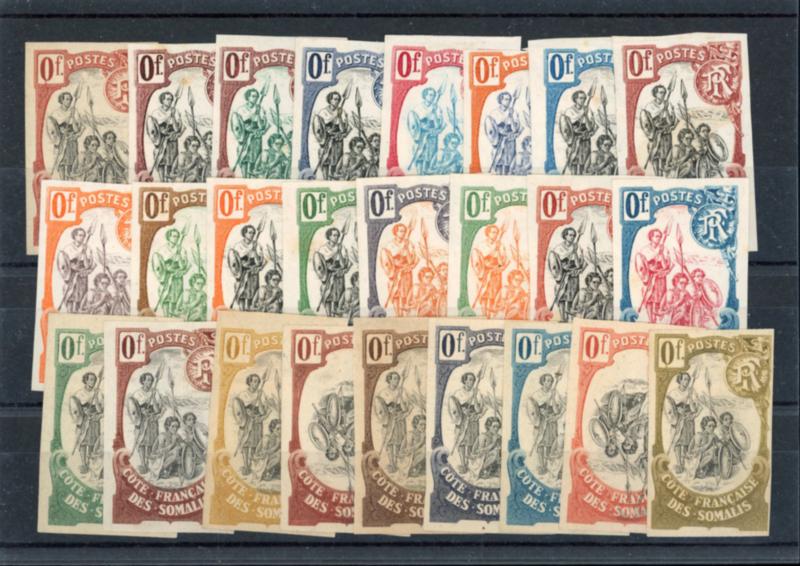 1902, type Guerriers lot de 25 essais de couleurs non dentelés sur papier cartonné, faciale 0f, pièces à priori toutes différentes, TB.