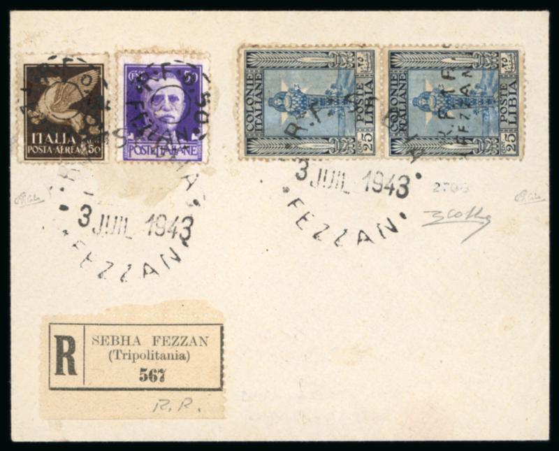 1943, très belle lettre recommandée du 03/07/1943 (Sebha) affranchie avec YT n° 18, n° 19 en paire avec superbe variété sans surcharge tenant à surchargé et PA n° 3, au delà de la superbe combinaison, la variété du n° 19 est sans doute unique (répertorié dans le Sassone n° 12c et mentionné comme tel
