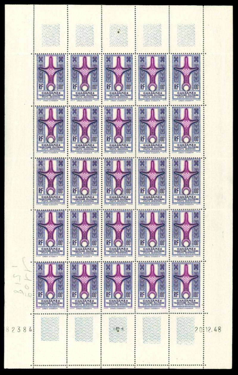 1949, Croix d'Agadès poste aérienne 100f lilas et rose-lilas (YT n° 2b, Sassone n° A6L) en feuille entière de 25 timbres neufs ** coin daté 20/12/48, grande rareté des Colonies Françaises, cote Yvert €66'250, Sassone €150'000, TB.
