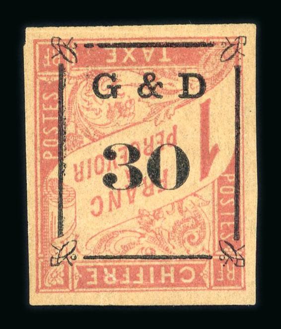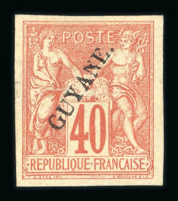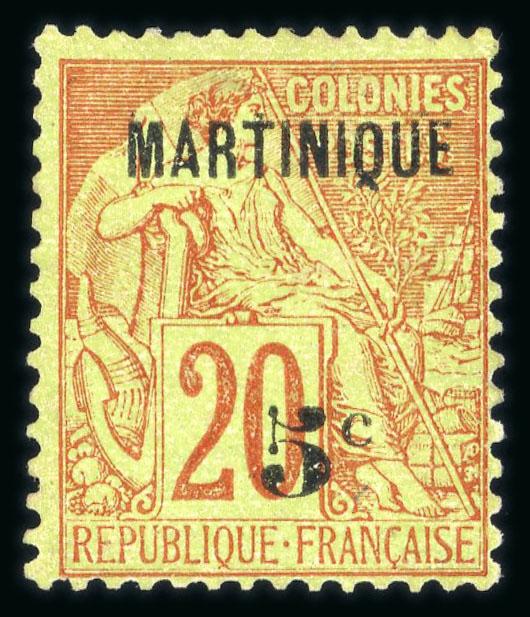 Martinique, 1886: Y&T n°1B, 5c sur 20c brique sur vert, neuf *, certificat Calves (2024) cote 20'000€ timbre très rare (tirage 50ex).