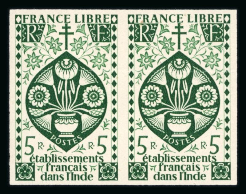 1942, série de Londres YT n° 217-230 (sauf n° 229) en paires non dentelés neufs **/*, quelques plis horizontaux tout à fait habituels pour ces timbres rares et en très bon état, cote €8190, TB.