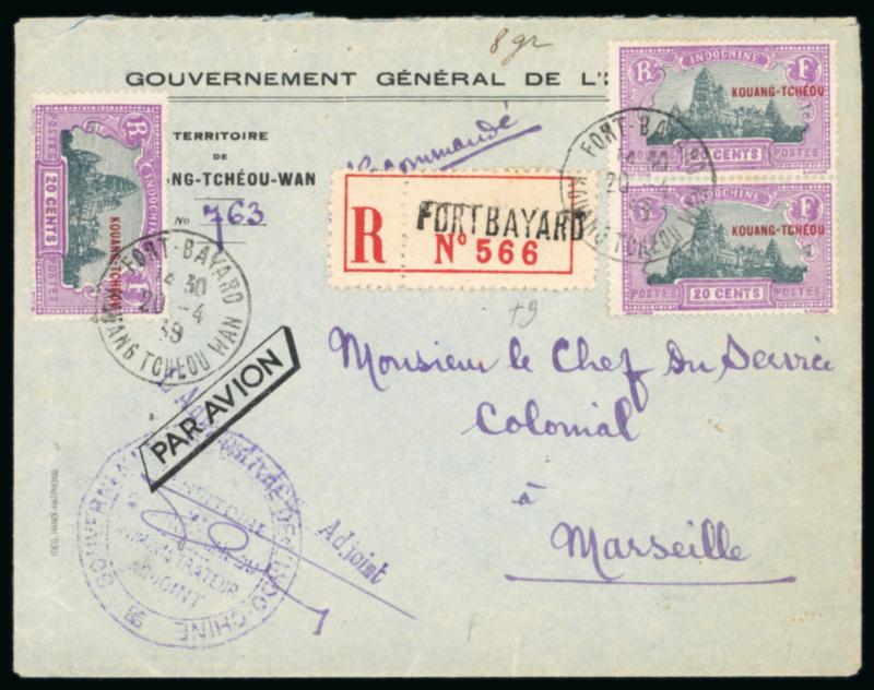 1939, Lettre par avion reccom. de Fort Bayard (Gouvernement general, territoire de Kouang-Tcheou-Wan) pour Marseille affr. avec 1927 20c (paire horizontale) pour Marseille via Hongkong, TB.