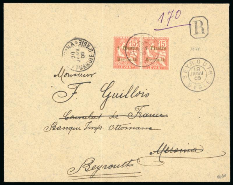 1905, YT n° 27c superbe paire avec variété Piastte tenant à normal oblitérée sur lettre recommandée pour Beyrouth, très belle qualité CV €3'150.