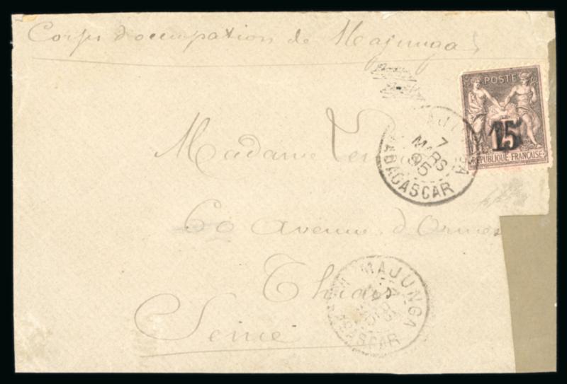 Majunga - Madagascar : 1895, Y&T n°6 15c. sur 25c. noir sur rose sur devant de lettre oblitéré cachet à date de Majunga du 7 mars 1895 pour Thiais. Seulement deux lettres connues.
