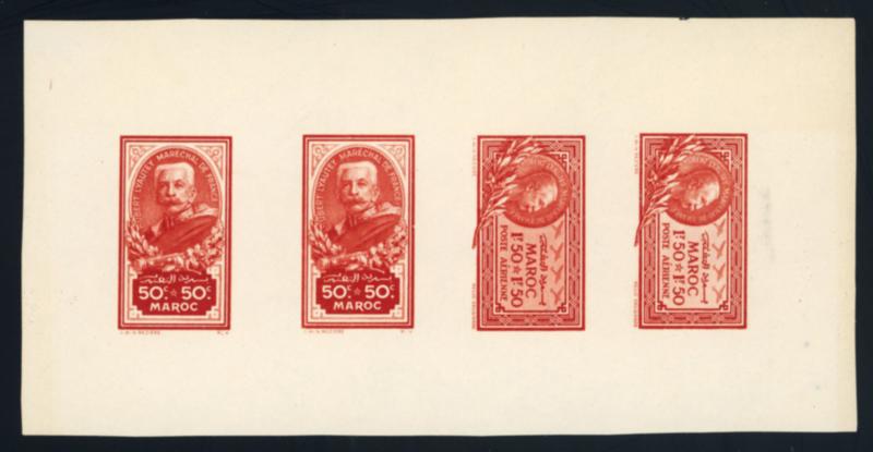 Maroc, épreuve collective dédiée au maréchal LYAUTEY en rouge (n°150 et PA 40). Non cotée dans le Yvert et le Dallay. Rare. Neuve* pleine gomme.