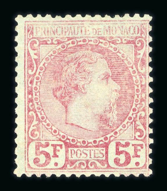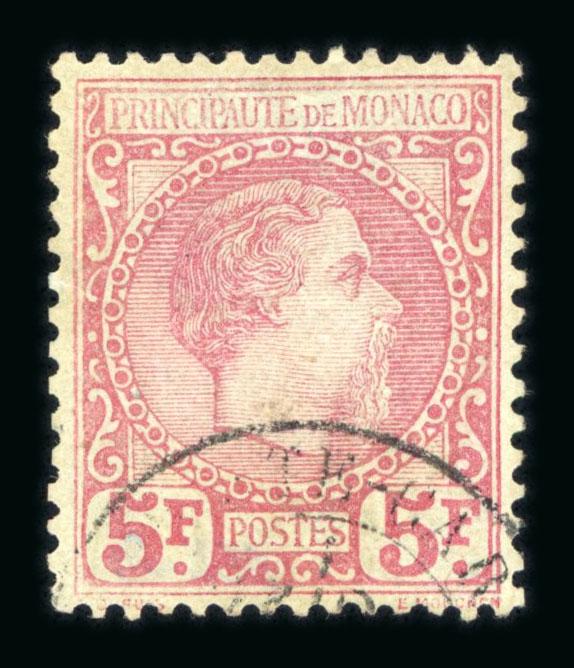 1885: Prince Charles III Y&T n°10, 5f carmin sur vert oblitéré Monte-Carlo, centrage parfait, 1 dent réparée sinon TB. Cote 2'700€.