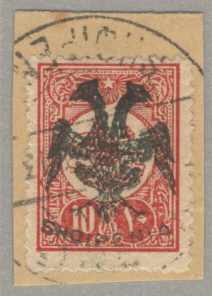 1913, 10 Pa., carmine, on piece, Turkish stamp with black opt, certificate Dr. Peters, signed multiple times (Prendushi, Droese, Diena), CV is 8000 € (+ 70% for very good perforation), genuine in all aspects, very rare, an exceptional piece, XF! Estimate 8.000€.