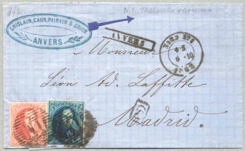 1862, 20cts, blue, 40cts, vermilion, on simple rate letter from ANVERS to MADRID, cancelled with scarce circular postmark "N1", on front double circle NORD No 1/1862 and boxed ANVERS as well as boxed PD alongside for a fully paid letter, on reverse spanish railway cancel and arrival cancel, 20 cts.