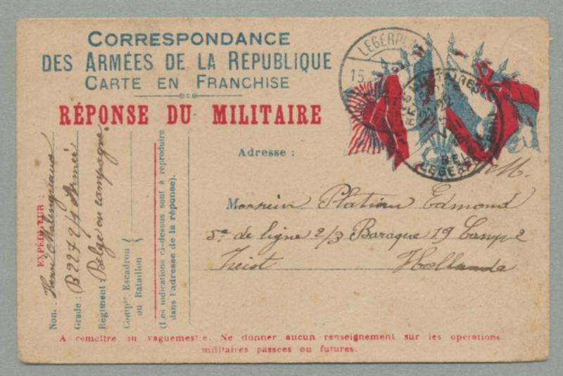 1916, from a Belgian soldier to Zeist, Holland, free military reply postcard REPONSE DU MILITAIRE of the French army, Regiment Belge en campagne, dated 3 juillet 1916, addressed to Platain Edmond, 5e de Ligne 2e Groupe Baraque 19, Corps 2, Tilburg, Holland, military postmark LEGERPLAGE 15 in black o