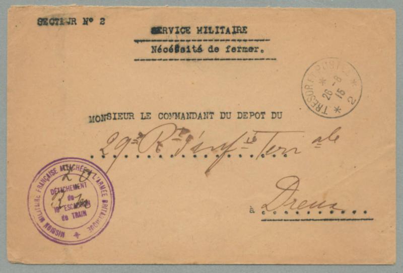 1915, from the French Military Mission attached to the British Army to Deux, official stampless military envelope with printed SERVICE MILITAIRE fold-over format, addressed to the Commandant du Dépôt du 29er Régiment de Tirailleurs Algériens à Deux, black circular date stamp TRESOR ET POSTES 2 dated