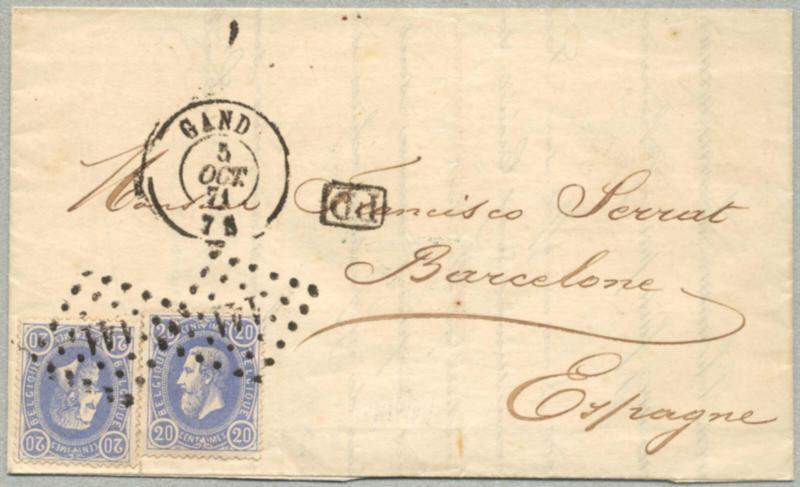 1871, 20 cts, ultra (2), on letter from GENT to BARCELONA, cancelled by lozenge of dots 141 and double circle GAND/78 and boxed PD for a fully paid letter alongside, on reverse clear arrival cancel, very fresh and attractive letter, VF-XF! Estimate 400€.