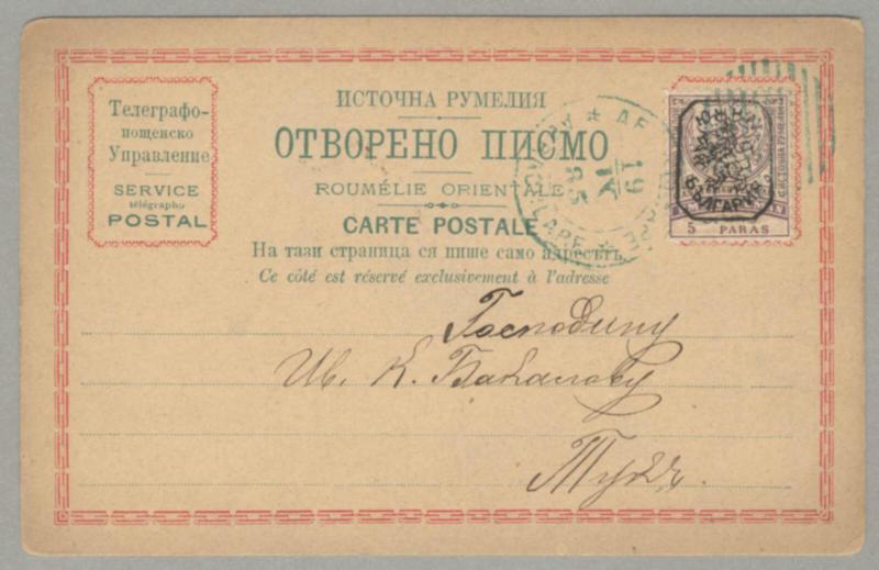 1885, from Eastern Rumelia, 5 paras with black boxed BULGARIA and heraldic lion opt, stamp on postal stationery card with boxed SERVICE TELEGRAPHIQUE POSTAL inscription, tied by green circular cancel of dated 19 9 85 from a locality in Eastern Rumelia, message in Bulgarian dated 19 September 1885, i