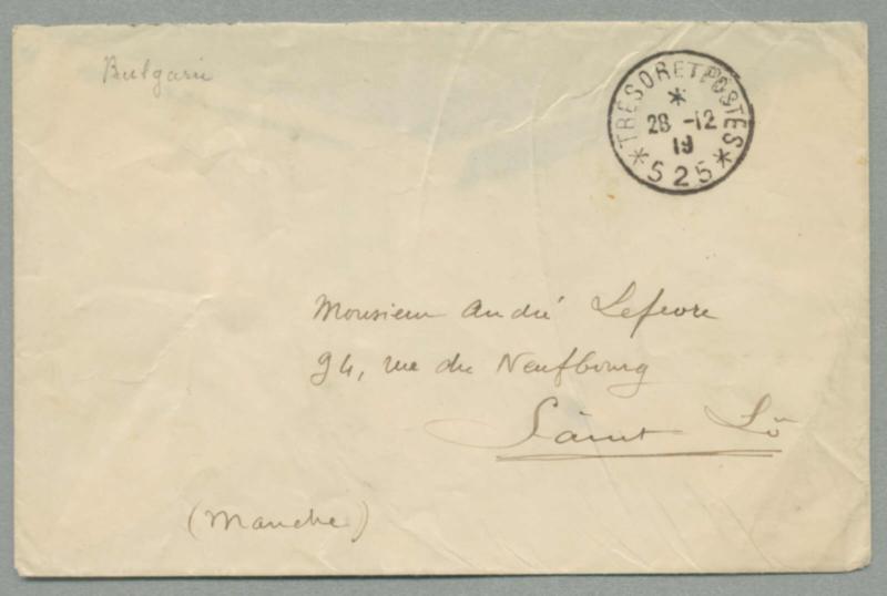 1919, from Bulgaria to Saint-Lô Manche France, stampless military envelope addressed to 94 rue de Neufbourg, posted from French army postal sector using circular TRESOR ET POSTES 525 cancel dated 28-12-19, no markings on reverse, written in neat cursive, part of French postwar occupation and advisor