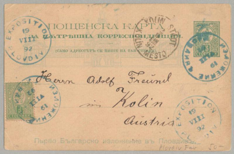 1892, from PLOVDIV to KOLIN, Austria, 5 stotinki stamped stationary card uprated with green Bulgarian 5 stotinki stamp, tied by EXPOSITION in Bulgarian 19 VIII 92 cancel, card also tied by EXPOSITION PLOVDIV 19 VIII 92 cancel, message written in German, sent during the Plovdiv International Expositi
