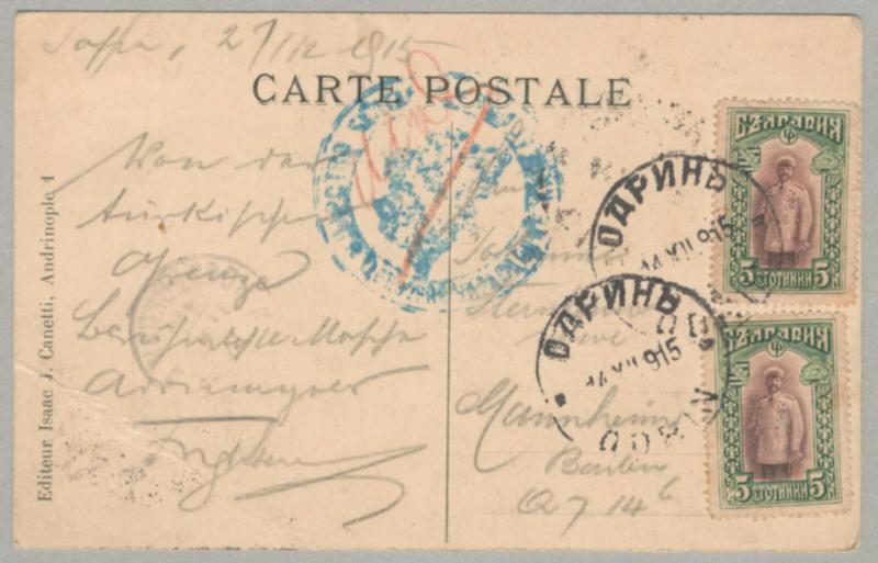1915, From Adrianopel (Bulgaria) to Mannheim (Germany), postcard franked with pair of 5 stotinki green and brown definitive stamps showing Czar Ferdinand I, cancelled with bilingual CDS ADRIANOPEL 4.XII.915 in black, blue circular censor cachet applied at center with red pencil notation crossing the