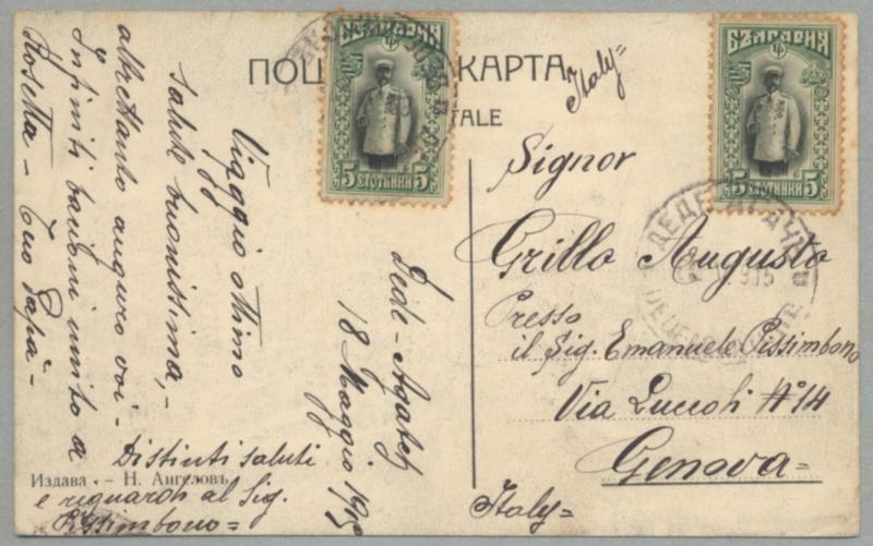 1918, from Dedeagatch to Genova, Italy, picture postcard showing the harbor of Dedeagatch (today Alexandroupoli), franked with two 5 stotinki green Tsar Ferdinand stamps of Bulgaria, tied by bilingual DEDEAGATCH CDS, clear Italian message with military context addressed to a civilian in Liguria, sca