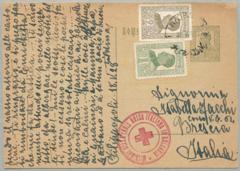 1928, from FILIPPOPOLI (Plovdiv) to BRESCIA, Italy, Bulgarian 1 leva postal stationery card uprated with 1 leva and 2 leva stamps, all tied by Bulgarian postmarks, FILIPPOPOLI 18.V.28 manuscript, red circular cachet Missione della Croce Rossa Italiana in Bulgaria on front, written in Italian, travel