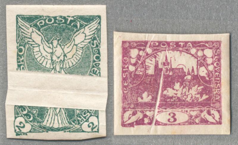 1918, 3 h, Hradcany and 2 h newspaper stamp with nice paper folds (slozka), mint, very attractive varieties, XF-SUP! Estimate 150€.