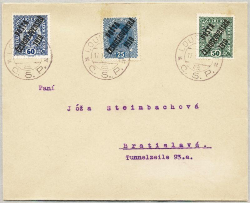 1920, 25 kr. + 50 kr. + 60 kr., on letter from LOUMOVICE to BRATISLAVA, tied with LOUMOVICE 17.1. 20, extremely fresh letter in perfect condition, XF! Estimate 600€.