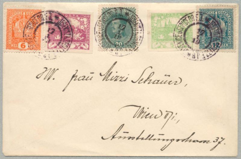 1919, mixed franking between Czech and Austrian stamps, 6+3+20+5+12h, 3+5h imperf, on philathelistic cover from JESEDNITZ b SEDNITZ/JESENICE u SEDICE to WIEN, fresh and desirable, VF-XF! Estimate 100€.