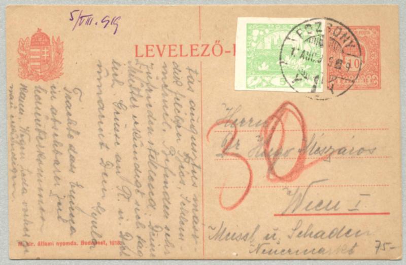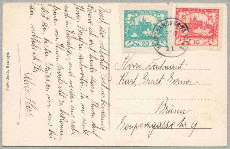 1920, 10h, dark red + 20h, bluish green, imperf, 20h on top ripped instead of cut - not touching the stamp, on postcard von KRASZNAHORKA to BRÜNN, fresh and desirable, VF-XF! Estimate 100€.