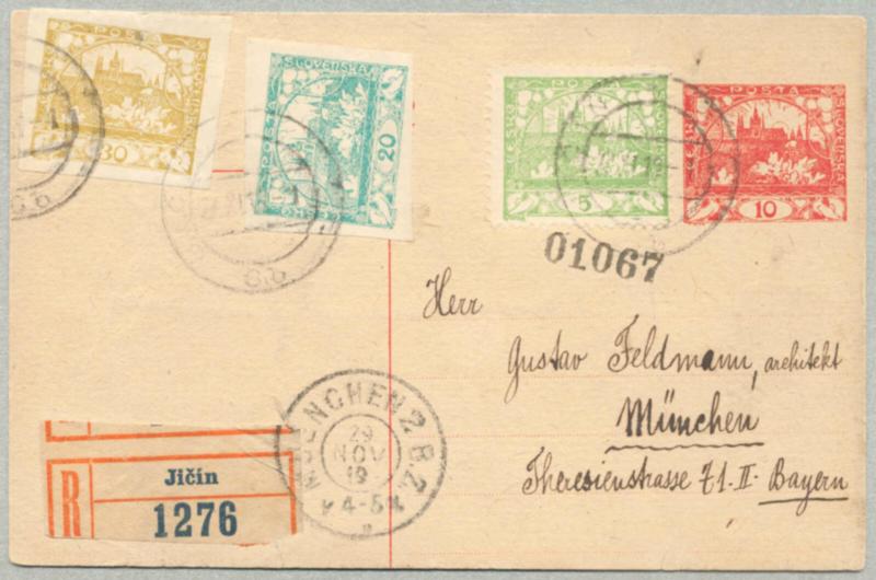 1919, 5+20+30h, (3), 20 and 30h imperf, on 10h postal stationary from JICIN to MUNICH/Germany, cancelled JICIN 27.XI.19, R label JICIN and arrival MÜNCHEN 29.NOV 19, handstamp number 01067, small tear at top not affecting the stamp, interesting and desirable, VF-XF! Estimate 120€.