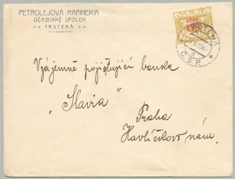 1920, 30h, bistre, imperf, red SO 1920 opt, on letter from TRSTENA to PRAHA, cancelled TRSTENA 27.V.24 CSP, fresh and desirable, VF-XF! Estimate 600€.