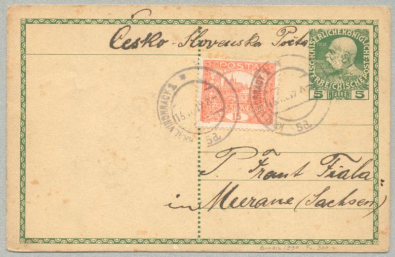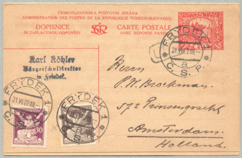 1919, FRYDEK, interesting mixed franking Hradcany with later issues, on stationary with answering card, very fresh and attractive, XF! Estimate 600€.